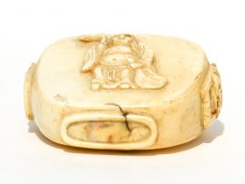 “Antique Carved Ivory Snuff Bottle” highly detailed carving of man in robes and faces on both sides of the bottle. Delicate carved ivory spoon attached to stopper in lid. Judging from the marvelous patina of the ivory, it is reasonable to assume that this bottle is between 100 to 150 years old. Not done for the tourist trade by a long shot.