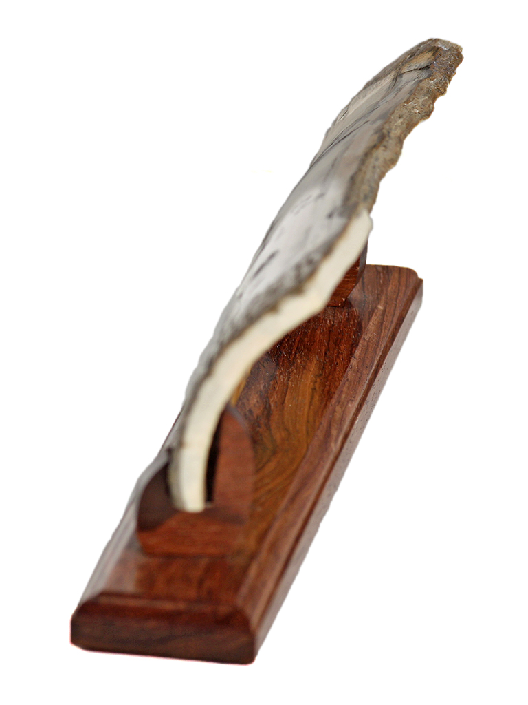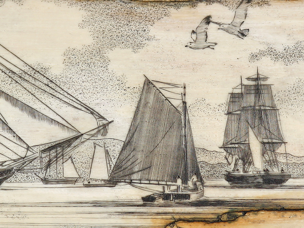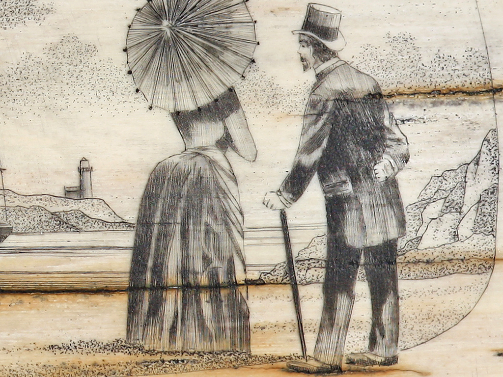 “At the Beach” black and white scrimshaw on ancient mammoth tusk ivory bark by Jim Pauls. Properly attired Victorian couple admiring the ships in the harbor. Pauls has filled the harbor with various vessels, some commercial, others pleasure boats. In the distance is the familiar lighthouse. Not to be forgotten are the two seagulls which appear in most of his work. He excelled in straight line work, but also used stipple for the sky. Excellent work all the way around. From the extensive collection of one of our clients who is no longer with us.
