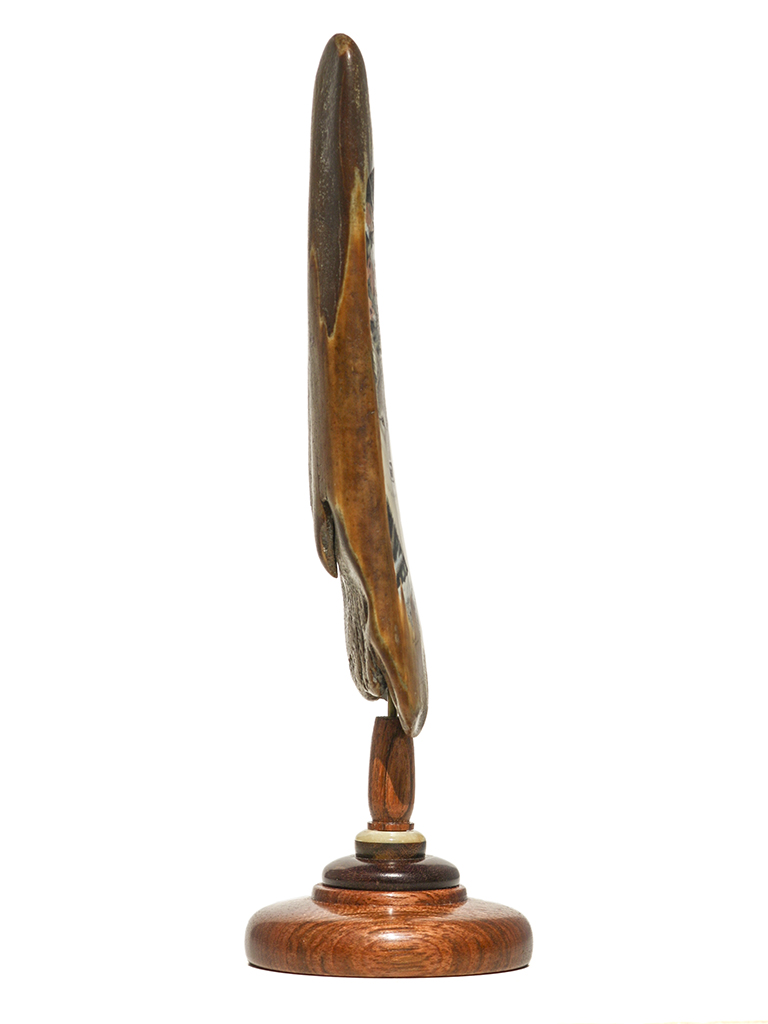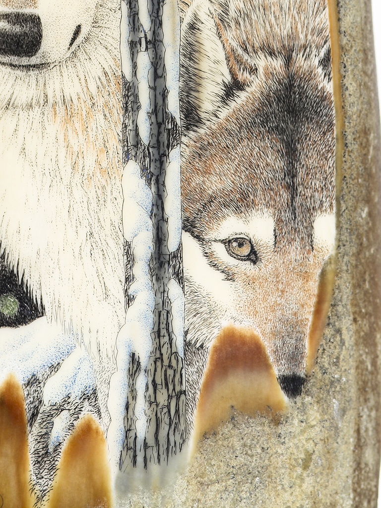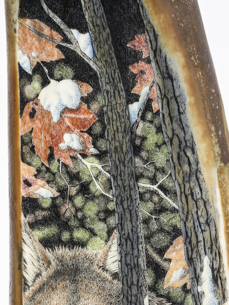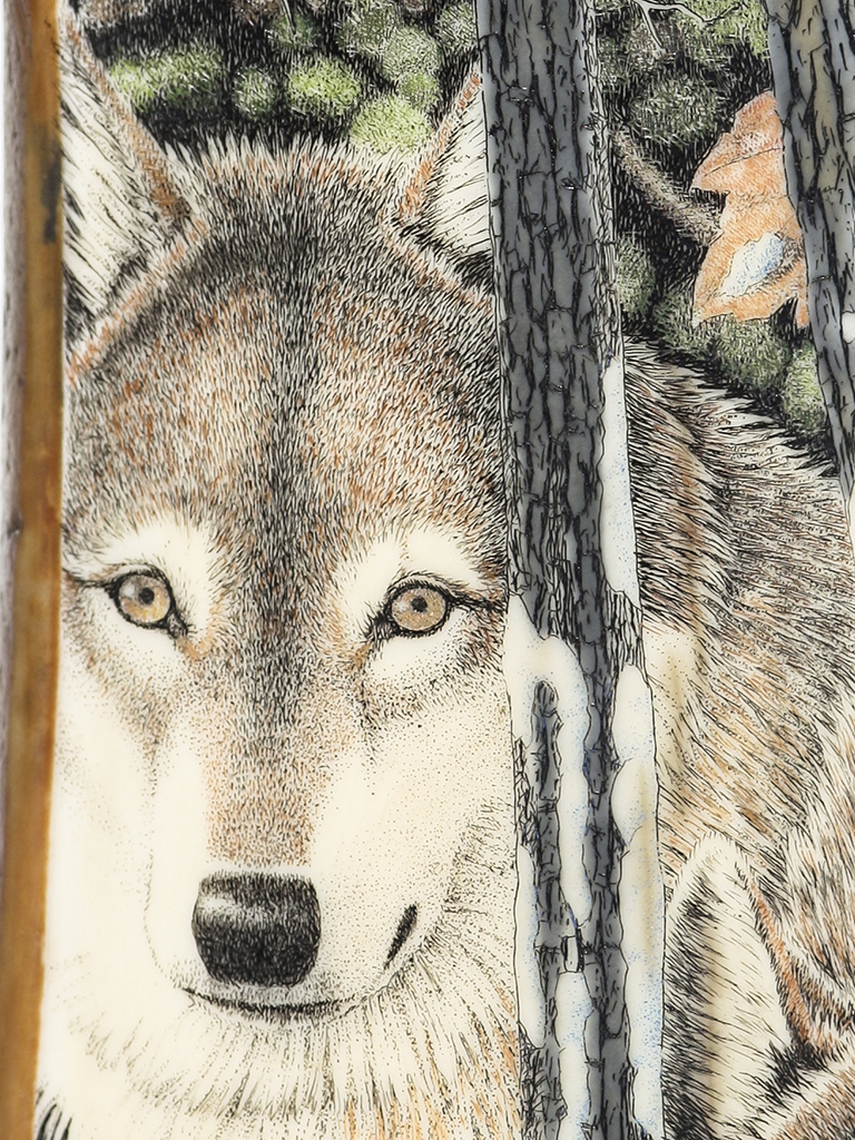 “Autumn Wolf” color scrimshaw on ancient walrus tusk ivory by David Adams. Fall foliage still on the trees after an early light snowfall. Have to admire the way scrimshander Adams, composes his works. Interesting addition of a partially hidden wolf at the bottom. First class work by Adams, as always. One of the very best working today, no doubt about it.