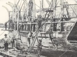 “Caulkers on the Sunbeam” black and white scrimshaw on large sperm whale’s tooth by Gerry Dupont. Caulkers and painters work on the whaler, Sunbeam, just returned from a long whaling voyage. Award winning scrimshander, Dupont, excels in such scenes. His attention to detail is outstanding as can be see in the closeup photos. The caption on the tooth reads as follows: “Floats provide a convenient place for painters and caulkers to work on the topsides of the whaling bark Sunbeam.” Large tooth weighs over one pound, 484 grams to be exact. Tasteful stand completes the picture.