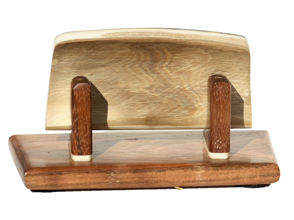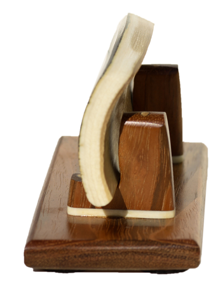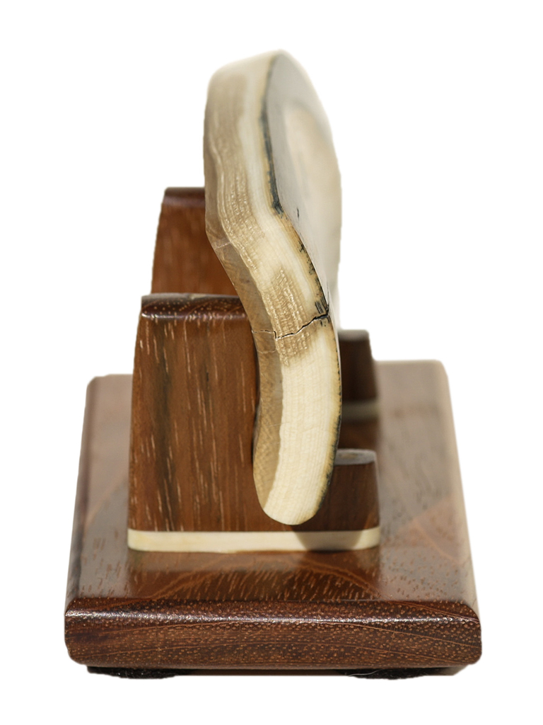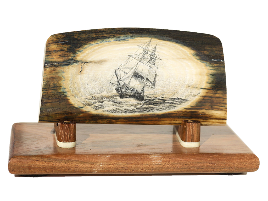 “Clipper in Stormy Seas” black and white scrimshaw on ancient mammoth ivory bark by David Adams. Wind whipped waves pound the clipper in stormy seas. Adams has done another masterful job on this gem. Very interesting piece of ivory, by the way. Notice the rings on the edeges of the mammoth tusk ivory. Gives the impression of rays of sun glistening through hazy mist. Quite rare.