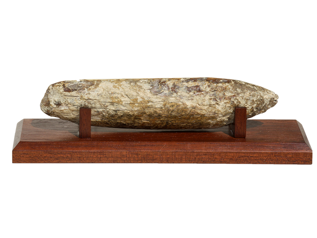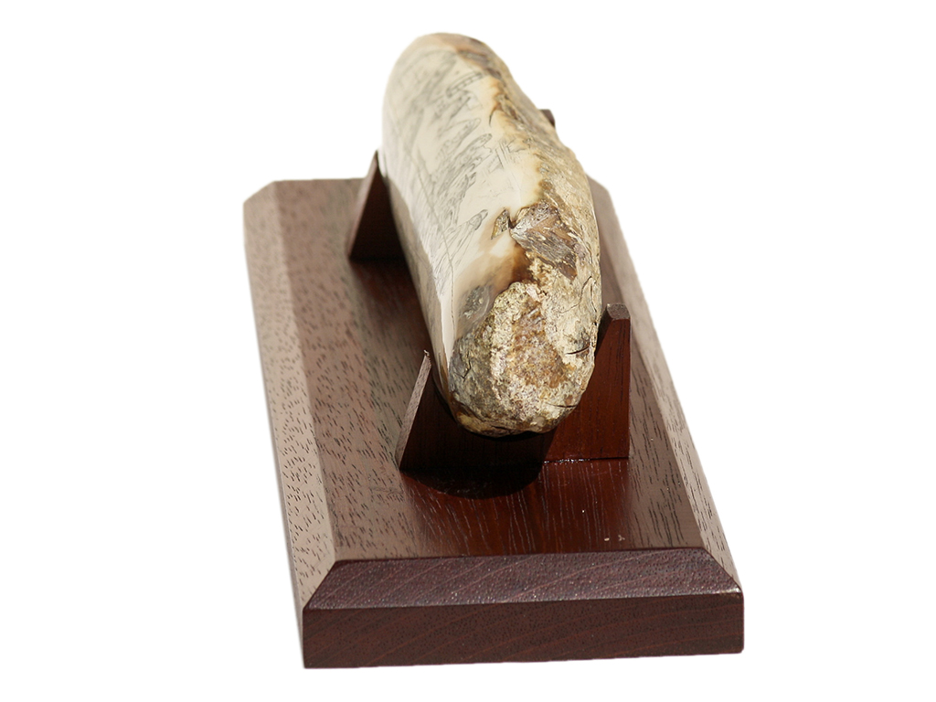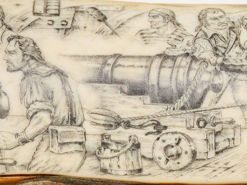 “Close Quarters Battle” black and white scrimshaw on ancient walrus tusk ivory artifact by Steve Willeford. Powerful work by Willeford on this one, The scene is below deck in one of the British battleships. One can only imagine the noise, smoke and utter fear that the men must have experienced. This was done on an ancient walrus tusk that was used as a net sinker for the people in the Northern Bering Sea area. Willeford was one of the very few who ever attempted these type of scenes by depicting the actual sailors up close. Other battle scenes featured complete ships firing broadsides at each other. This is from the collection of one of our clients who is no longer with us. Steve did not produce a great volume of work, so this is quite rare. Fine addition to a nautical collection.