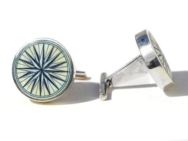 “Compass Rose Cufflinks” black and white scrimshaw on ancient mammoth tusk ivory by David Smith. Incredible detail by master scrimshander, Smith. Set in sterling silver, these will be worn with pride by both men and women for years and years.