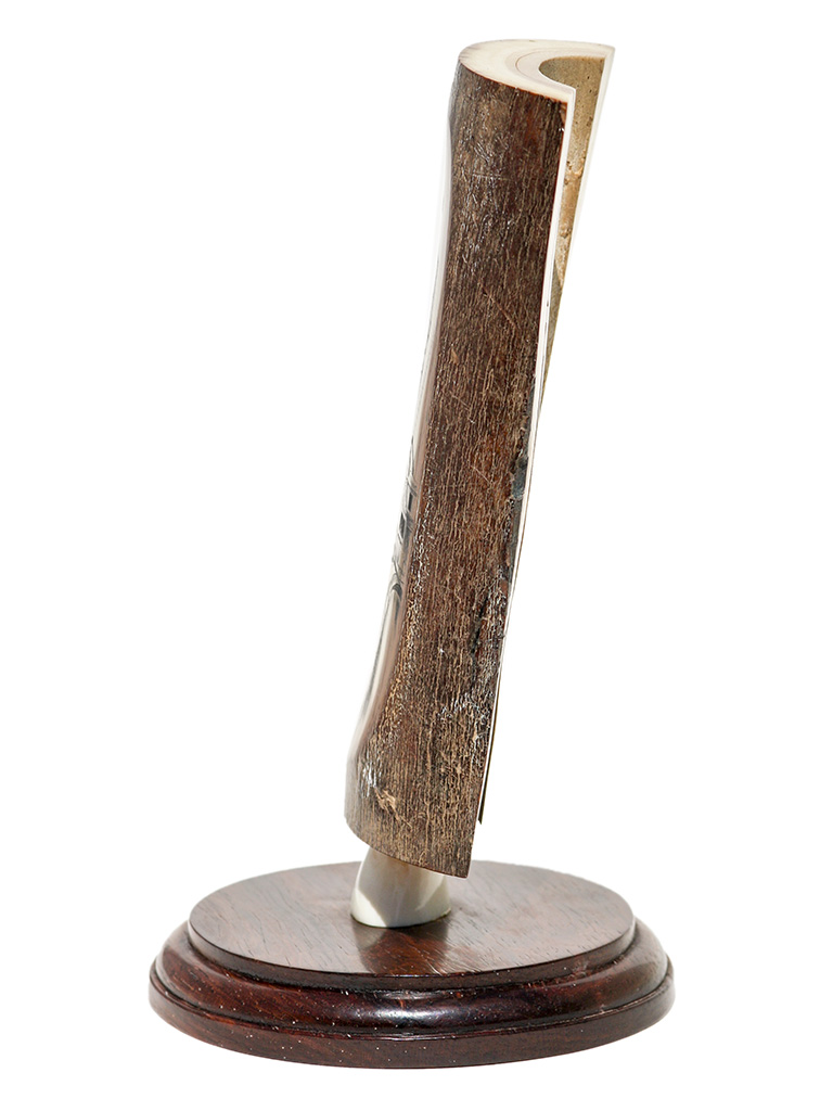 “Cooper and Whale Oil Cask” black and white scrimshaw on ancient mammoth tusk ivory by Gerry Dupont. Grizzled cooper stands atop one of his prized works. Behind him, one can see two vessels moored at the wharf. Dupont’s work on this is simply outstanding. Note the detail in the cooper’s clothing, all wrinkled and worn. Impressive piece of mammoth tusk ivory mounted on a handsome rosewood stand. The back side of the ivory has also been polished, something seldom seen. From the collection of one of our clients who is no longer with us.