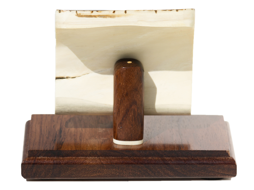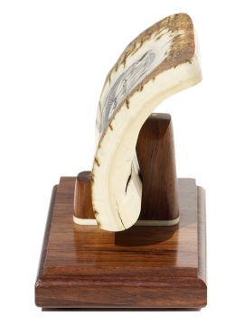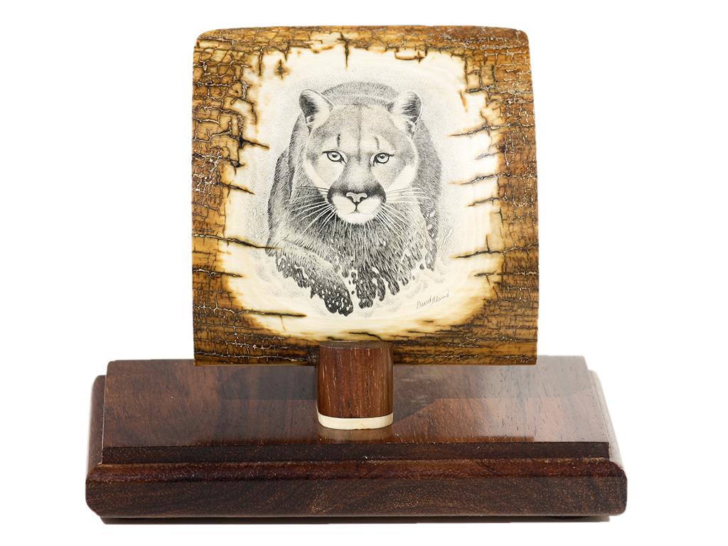 “Cougar Splashing ” black and white scrimshaw on thick ancient mammoth tusk ivory bark by David Adams. Closeup view of cougar splashing in water, probably chasing his next meal. Adams has really zeroed in on the intensity of the large cat. Love his small touch of color in the piercing eyes, a brilliant addition. This is done on a very thick piece of mammoth ivory. Don’t have many pieces this size and weight around. Very impressive work, indeed.