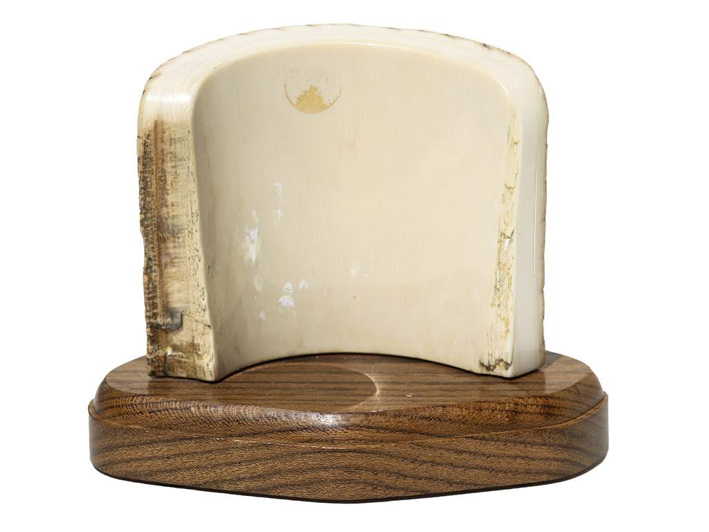 “Escaping Whale” black and white scrimshaw on ancient mammoth tusk ivory by Ray Peters. Very thick piece of mammoth ivory with perfect surface, no stains or discoloration whatsoever. Peters is the best known black and white nautical scrimshander working today. Actually, he did this for us in 2013 as can be seen next to his signature. This is from the collection of one of our clients who is no longer with us. Excellent opportunity to add a first rate Peters scrimshaw to your collection at 2013 prices!