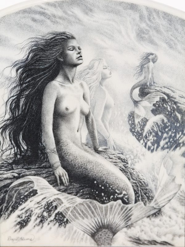“Homer’s Sirens at Work” black and white scrimshaw on huge slab of pre-ban African Ivory created by David Adams. The song of the sirens drew mariners to their death. These seductive sirens have generated a storm to lure Odysseus to his death as he makes his way back after the Trojan Wars. Circe had warned Odysseus about them, however, and Odysseus instructed his crew to place beeswax in their ears in order to block out the sirens songs. Odysseus had his crew lash him to the mast so he alone could experience the song. This piece took the scrimshander several months to complete, but the wait was well worth if. Don’t think I’ve ever seen better black and white scrimshaw.