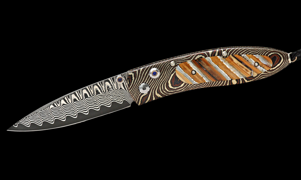 The Monarch ‘Painted Butte’ features a beautiful frame in ‘Twist’ Mokume Gane, inlaid 10,000 year-old fossil Woolly Mammoth tooth. The blade is ‘Wave’ damascus steel with an extra strong core in ZDP-189. The one-hand button lock and the thumb stud are set with sapphires. The Monarch is a simple design that is easy on the eye and effortless in the hand; the elegant shape of the handle on this design is also an ideal canvas to showcase our exotic materials. The ‘Painted Butte’ is the beautiful balance between elegance, function, modern and exotic materials.