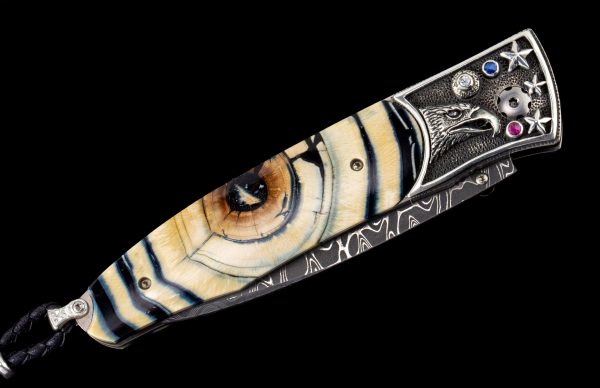 The Gentac ‘Bold’ features a beautiful frame in hand-carved sterling silver, inlaid with 10,000 year-old woolly mammoth tusk. The blade is hand-forged ‘Intrepid’ damascus by Chad Nichols. The one-hand button lock and the thumb stud are set with red garnet gemstones. An exceptional design that offers rigorous performance in a sleek, comfortable knife, the Gentac is also the perfect canvas to showcase William Henry’s range of exotic materials and techniques. The ‘Terra’ features the craftsmanship, hi-tech, and forged metals that are the hallmark of William Henry’s collections; a distinctive personality statement to be worn and used for a lifetime.