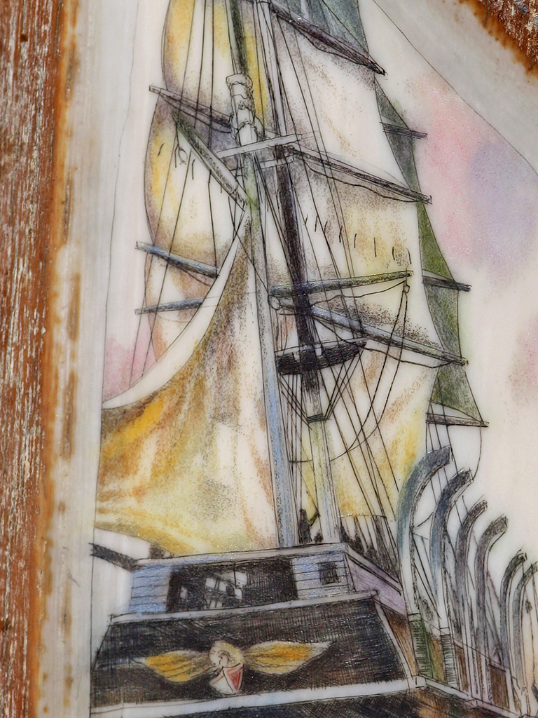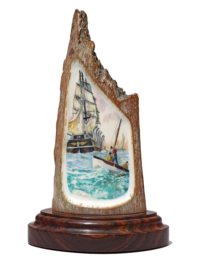 “Lowering Whaleboats” color scrimshaw on ancient mammoth tusk ivory bark by Chris Lehwalder. Veteran scrimshander Lehwalder’s work is instantly recognizable. Long considered the premier color nautical scrimshander working, his colors, tones and composition make a Lehwalder nautical scrimshaw a prized possession for any scrimshaw collector. This is from the collection of one of our clients who is no longer with us and is priced to move.