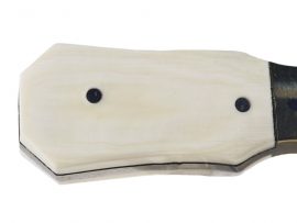 “Miniature Damascus Knife” handmade, one of a kind mini knife with Damascus blade, mammoth scales created by unknown maker. This gem is from the collection of one of our clients who is no longer with us. Do not know where he acquired the knife or who the maker was. Very nice work, however. Something unusual for any discerning collector.