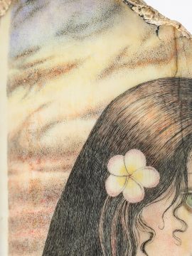 Portrait of Johanna color scrimshaw on ancient walrus tusk ivory artifact by David Adams. Simply stunning work by one of the very best working today. This blue eyed beauty is captivating. Love the matching tones of the marvelous sunset, the delicate flower and the blouse. Check out the pendant around Johanna’s neck. This is done on a very heavy (13 oz.) net sinker approximately 500-1500 years old. Not many of this size around today. Great work!