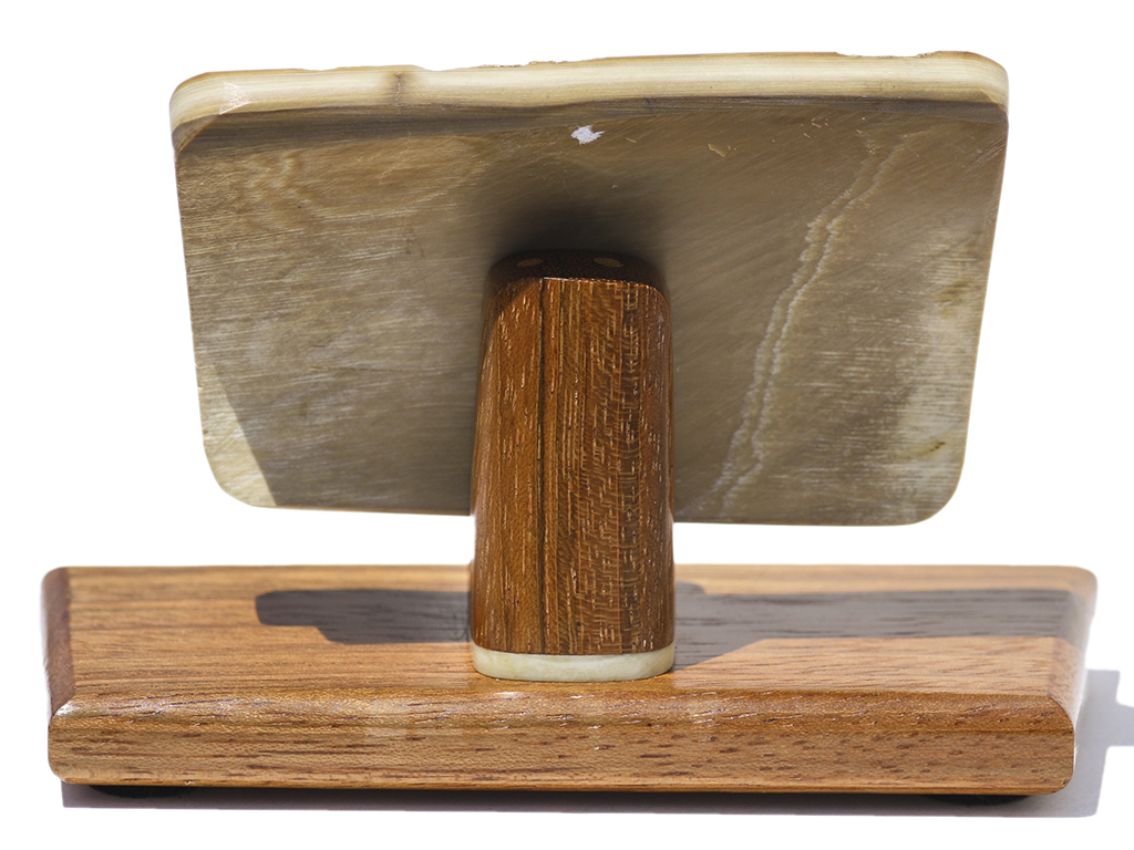 “Roaring Grizzly Bear” black and white scrimshaw on ancient mammoth tusk ivory bark by David Adams. Ill tempered grizzly is upset about something or someone. Best to get out of his way, pronto. This powerful work seems to jump off the ivory. For wildlife and bear collectors this one is a rare find. Great, solid piece of mammoth bark completes the picture.