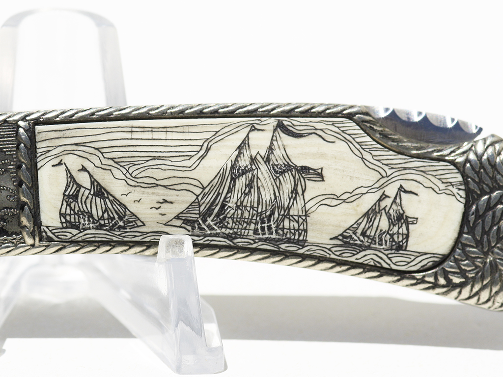 “Smooth Sailing McDowell Knife” black and white scrimshaw by the late Sam McDowell with Oxbone scales. Created in 2005 from the collection on one of our clients who is no longer with us. Knife never carried or used. Pristine condition. Blade stamped “Collectors Knife by Sam McDowell”. Made in Seki City with highly polished surgical stainless steel blade.Impressive file work. Excellent opportunity to add a McDowell to one’s collection at 2005 prices.