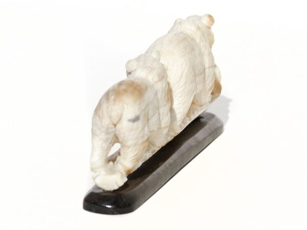 “Two Bears with Cub” created by talented unknown carver on ancient walrus tusk ivory. Note how the cute cub has been completely polished, waiting for its winter coat. Nice color in the ivory the result of minerals that have been absorbed into the ivory over hundreds and hundreds of years during which it was buried in the northern Bering Sea area. Fine work.