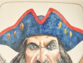 Two Fisted color scrimshaw on ancient mammoth tusk ivory created by Gary Williams. Fearsome depiction of one very scary pirate. Excellent detail, specially the fierce gaze of the well dressed pirate (the the matching red on his headpiece and the rolled cuffs. Nice. Could make GQ in today’s world. Excellent work.
