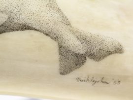 “Whale Tooth Scrimshaw Newport” black and white scrimshaw on large whale’s tooth by Micklejohn. This is done using stipple method of scrimshaw, thousands and thousands of tiny dots. Not familiar with the scrimshander, but it was created in 1983 and is from the collection of one of our long time clients who is no longer with us. May have obtained it in Alaska, but not sure. Tooth was drilled on the bottom for a stand which was not found. Tooth itself is in fine condition.