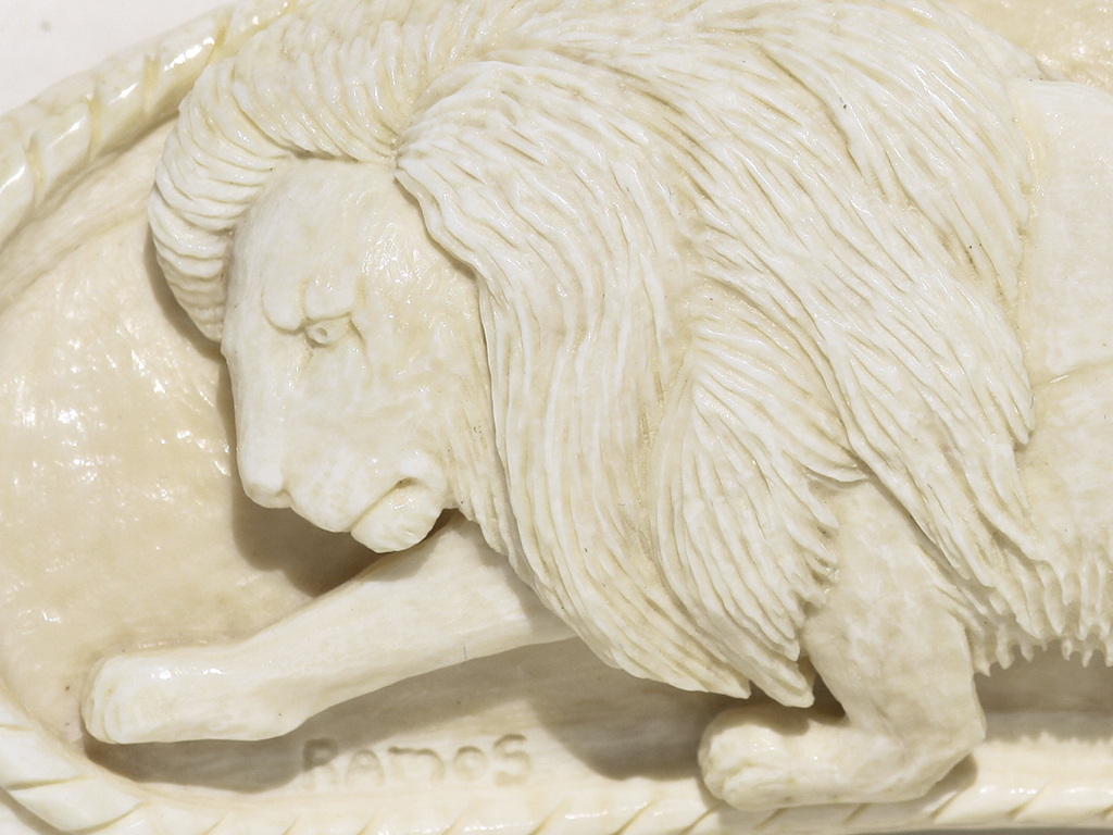 Whale’s tooth carving on a very large tooth by Armando Ramos. Excellent detail by Ramos on this one. Love the appearance of the impressive mane on the male lion. This if from one of our long time clients who is no longer with us and was probably created in the late 1980s. Heavy tooth weighing one pound. Not many like this today.