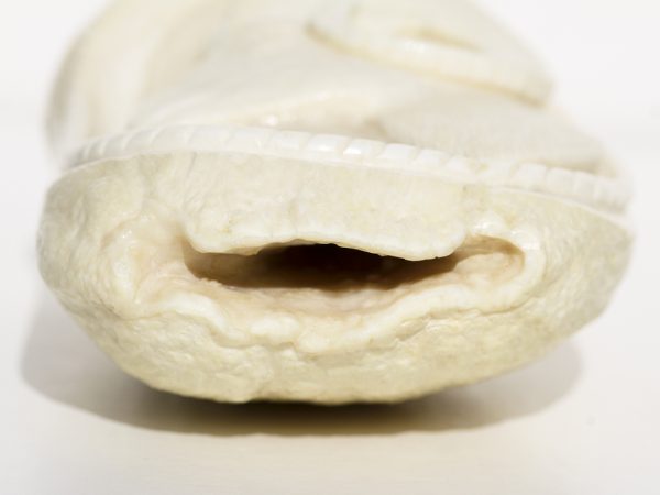 Ram’s head carving on whale’s tooth by Armando Ramos. Note how the tip of this large tooth has been worn down, indicating that it was from a large bull sperm whale. Ramos probably created this in the early 1980s. It is from the collection of one of our long time clients who is no longer with us. Excellent opportunity to add a beautiful carving at 1980s prices.