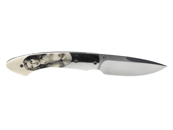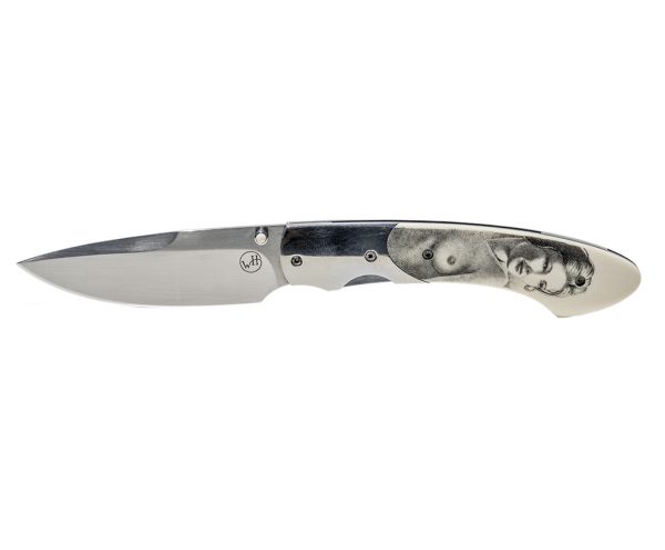 This William Henry scrimshaw knife features stunning nude portraits of a beautiful brunette done by scrimshander, David Adams, on both sides of this rare T-12 William Henry knife. As William Henry collectors know, the liner lock knife was the original locking mechanism used in the beginning, before today’s button lock by William Henry. Scrimshaw Gallery replaced the original Ironwood scales with pre-ban African Ivory, work that was done by the late Ken Fredericks. We came across these last two knifes in our storeroom and decided to have the work done by Adams, a wise decision obviously. A great addition to any knife or scrimshaw collection.