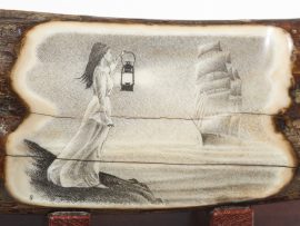 “Woman with Lantern” black and white scrimshaw on ancient walrus tusk ivory by David Smith. Moody depiction of mysterious woman with lantern appearing to signal, or guide, a full rigged clipper in dense fog. Is the woman attempting to alert the ship of its danger, or is she a modern day siren guiding them to their destruction? One of the many great things about art are the questions raised over and over many years. Think Mona Lisa’s smile. Large chunk of fossil walrus (14.6 oz.) mounted on beautiful bubinga stand complete the picture.