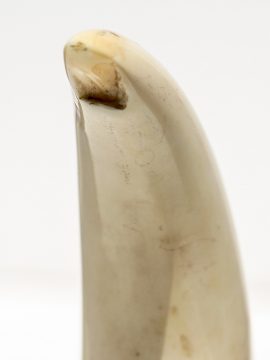 Raw whale’s tooth ivory excellent for scrimshaw, carving, jewelry or just collecting. Not many of these around today. By the way, no whale in the history of mankind was ever harvested for its teeth. Stand by the late Ken Fredericks. Slight chip on tip.