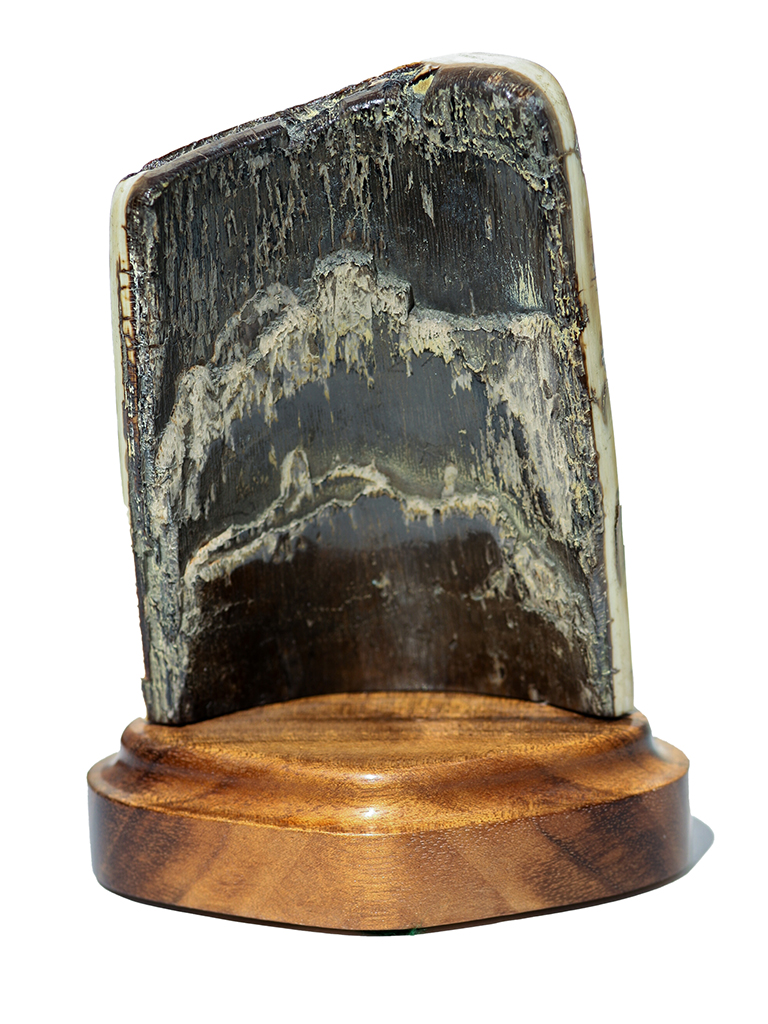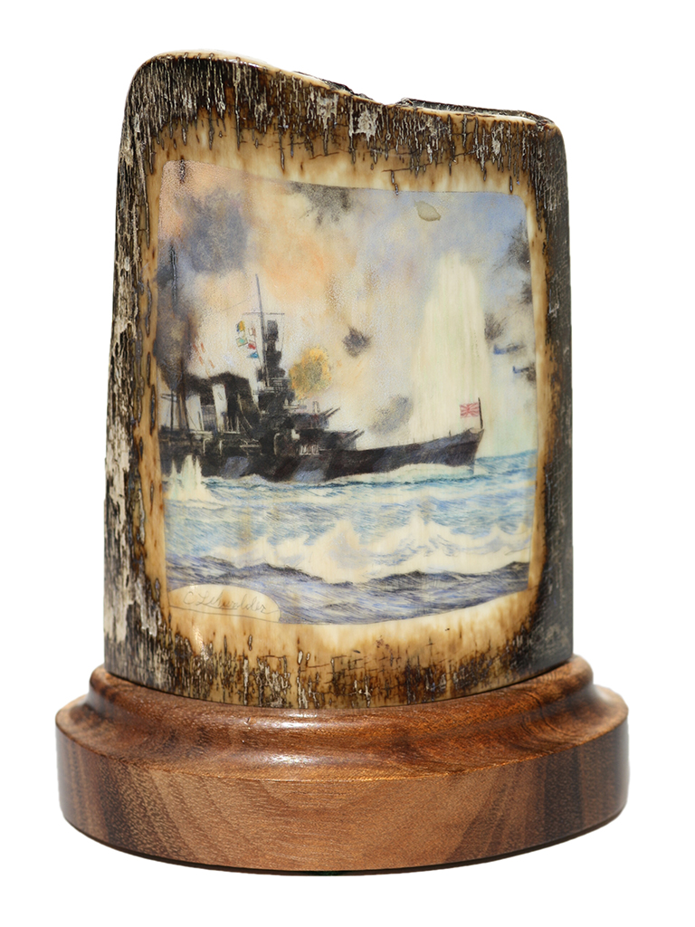 “WWII Battle at Sea” color scrimshaw on ancient mammoth tusk ivory bark by Chris Lehwalder. Well known scrimshander, Lehwalder, has done several WWII battle scenes on larger walrus tusk pieces that sold to collectors for several thousands of dollars. Rare opportunity to add a Lehwalder battle scene at this bargain price. Japanese ship has just been hit by U.S. aircraft that can be seen on the top right side of the ivory. Battle is just beginning, but the winner is already known. This is from the extensive collection of one of our clients who is no longer with us.